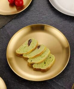 Un plat à servir en métal inoxydable de 28 cm de diamètre de couleur dorée de la marque Karaca