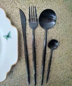 Un pack de couverts de table composé de 6 couteaux, 6 fourchettes, de 6 cuillères à dessert et de 6 cuillères à soupe en acier inoxydable de couleur noire passable au lave vaisselle. Le matériau utilisé est d’une qualité supérieure, solide et pérenne. Son pourcentage en chrome lui offre une excellente résistance à la corrosion