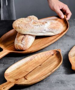 Un grand plat à servir en forme de feuille de 40 cm fait en bois naturel poli et travaillé à la main