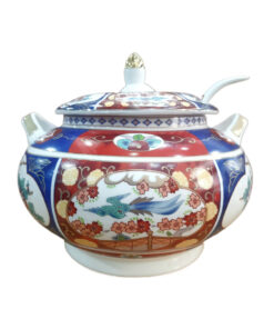Un service de table en porcelaine fine ultra blanche pour 12 personnes composé d’une soupière d’une louche de 12 bols de 12 petites assiettes et de 12 petites cuillères