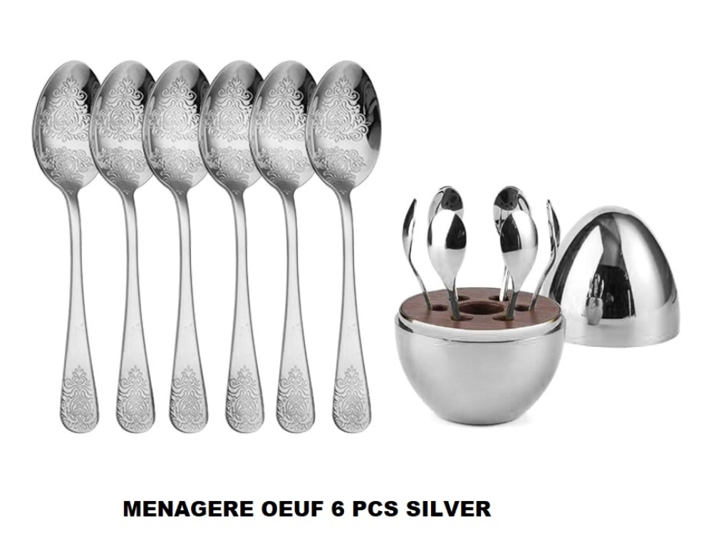 Une coque sous forme d’œuf composé de 6 cuillères à café en métal inoxydable de couleur Argentée