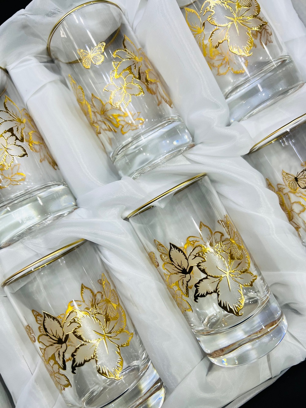 Fabriqués en verre transparent, ces verres laissent transparaître la couleur de votre boisson tout en mettant en valeur un superbe design de fleurs et de papillons en couleur dorée, ajoutant une note d’élégance et de charme à votre table.