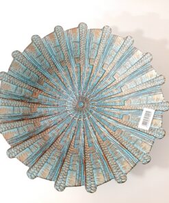 Une grande assiette à servir de 40 cm de diamètre de forme ronde et creuse en verre nuancée entre le gris et le bleu