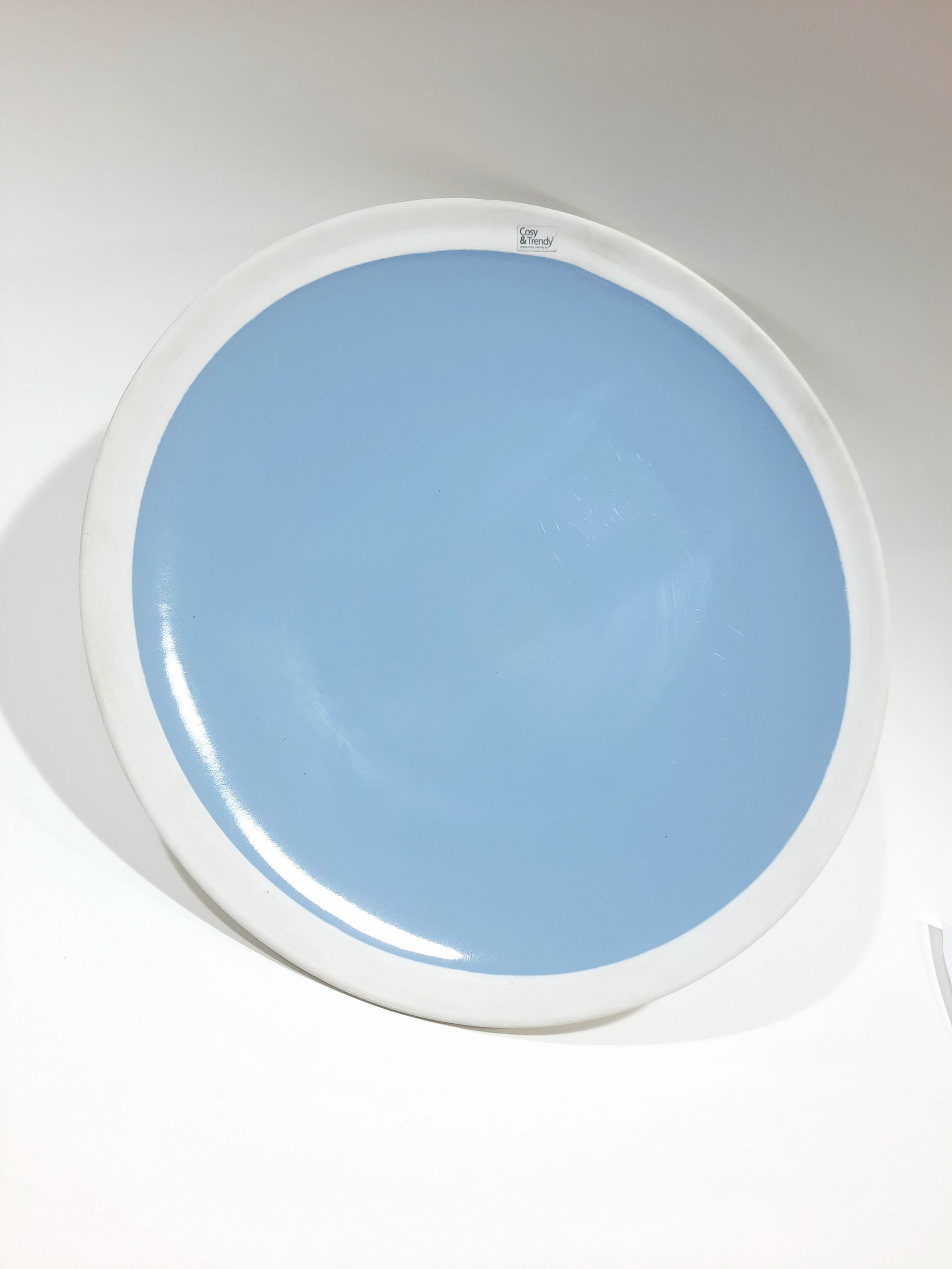 Une grande assiette de 28 cm de diamètre en porcelaine de couleur blanche et bleue de la marque Cosy Trendy