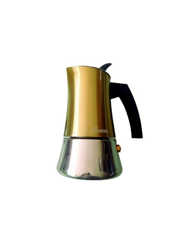 Une cafetière en métal inoxydable d’une capacité de 2 tasses de couleur dorée