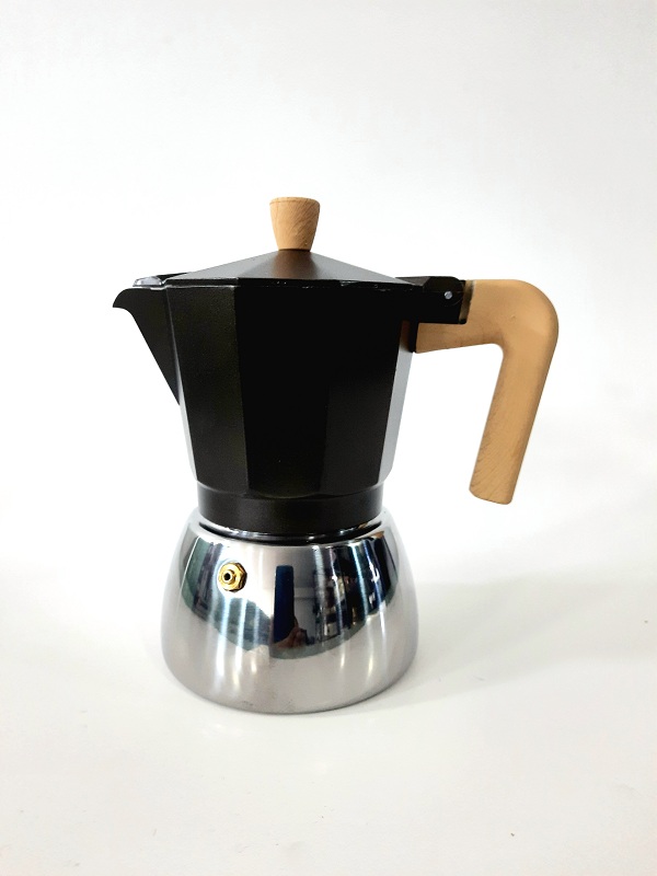 Une cafetière à pression en aluminium d’une capacité de 6 tasses avec main en bois