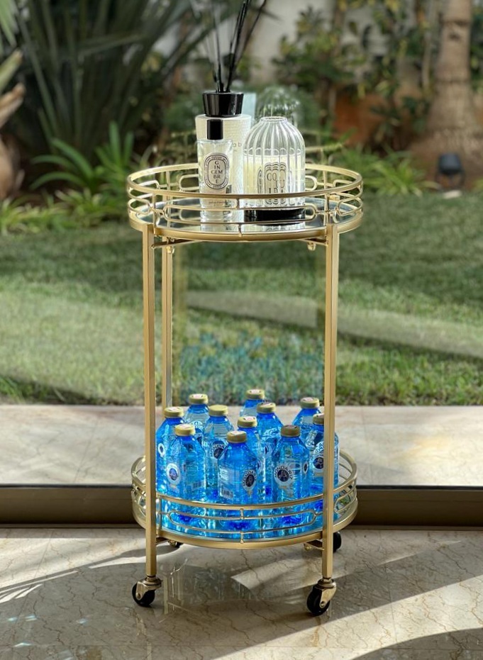Un chariot métallique de couleur dorée de 69 cm de hauteur composé de deux niveaux de 38 cm de diamètre