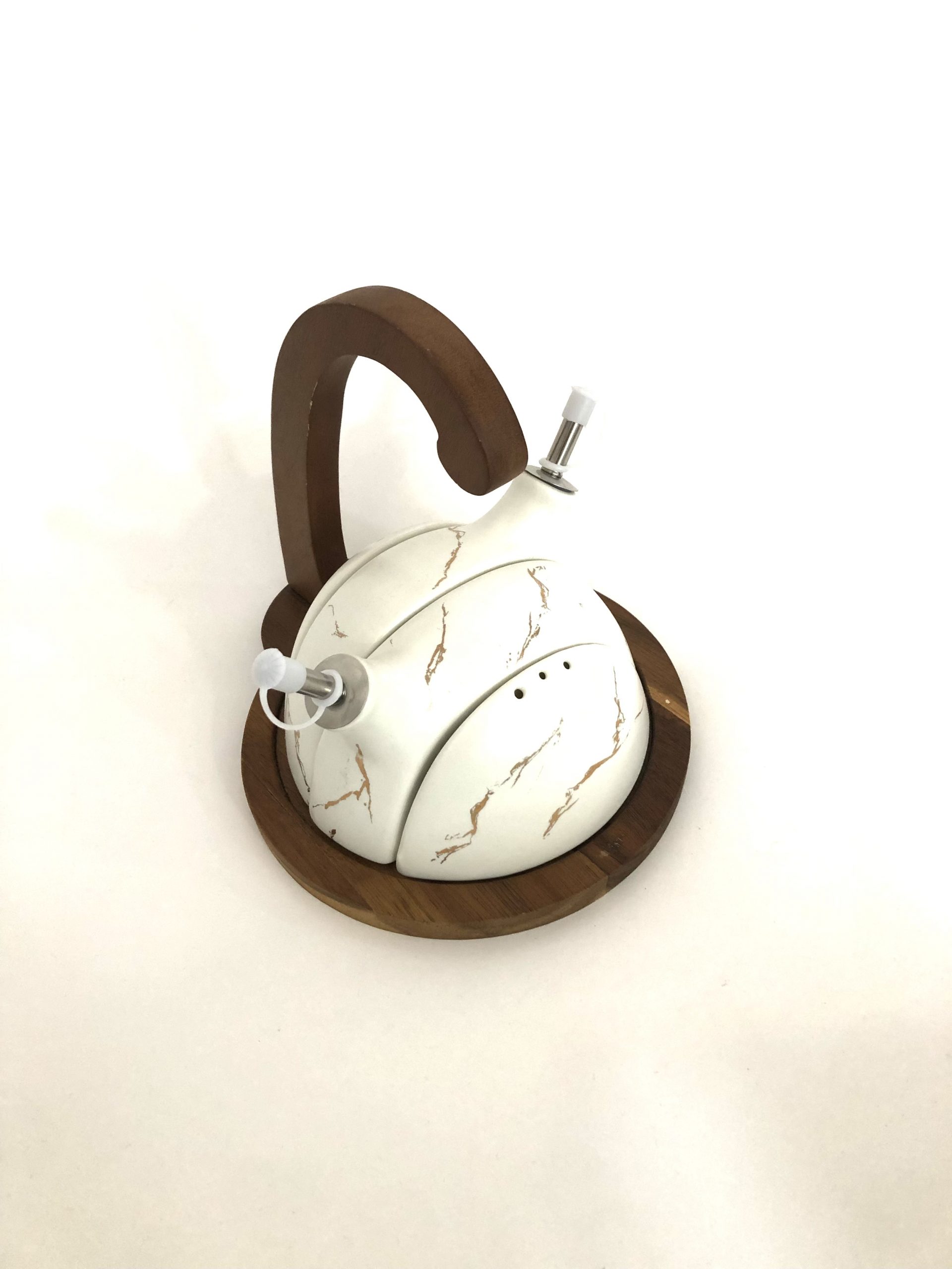 Un set de deux huiliers et de deux salières en porcelaine de couleur blanche avec un support en bois