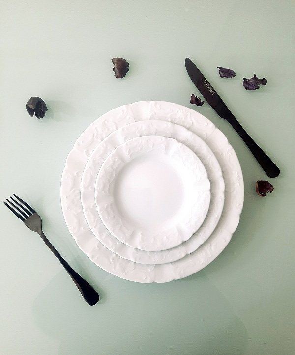 Un service de table en porcelaine blanche de la collection Mary Antoinette composé de 6 grandes assiettes de 27 cm de 6 assiettes moyennes de 21 cm et de 6 petites assiettes de 16 cm