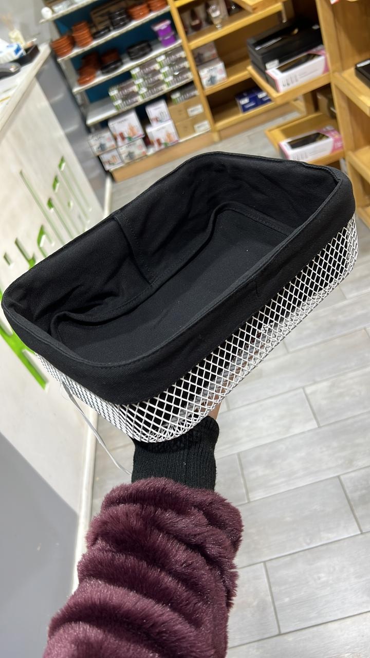 Un panier à pain de 28 cm x 20 cm en tissus de couleur noire avec support en métal de couleur blanche