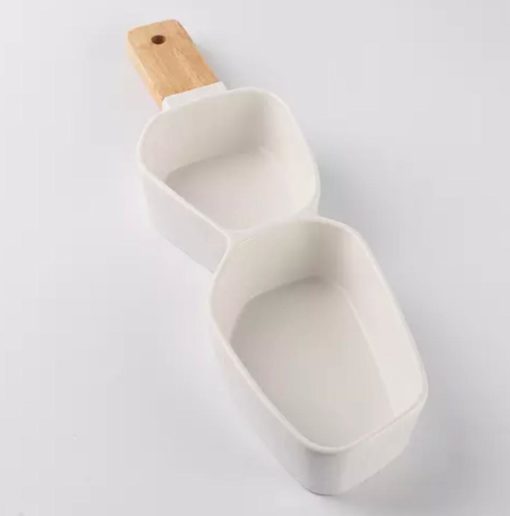 Un plat à servir en porcelaine de couleur blanche composé de 2 compartiments avec poignet en bois