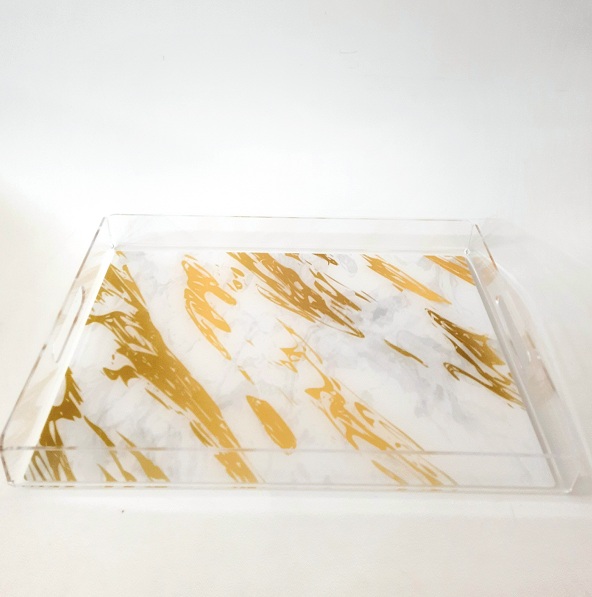 Un plateau en plexiglas de forme rectangulaire avec motif doré de 38 cm x 28 cm