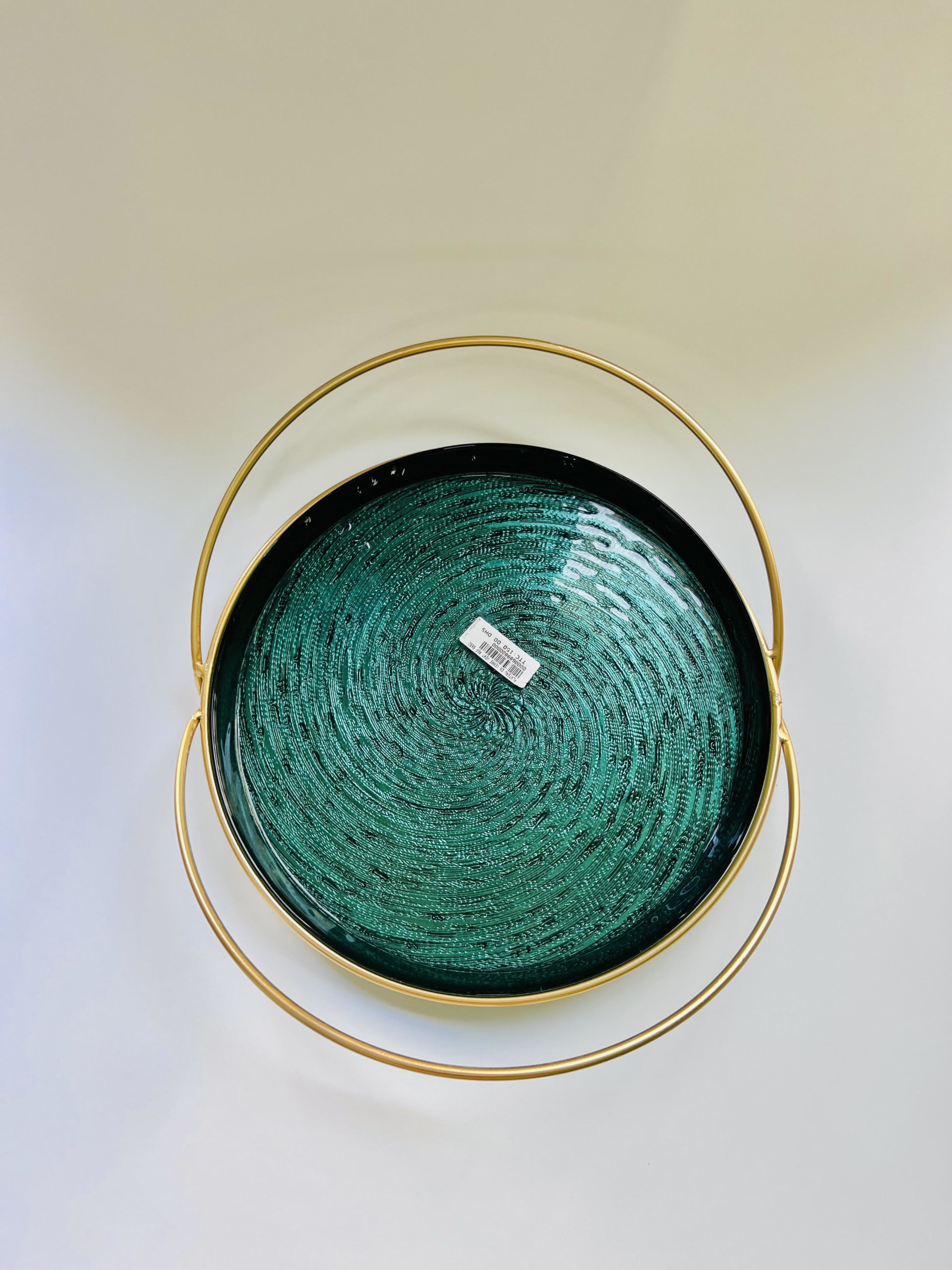 Un plateau à servir de forme ronde de 34 cm de diamètre de couleur verte avec un support en métal de couleur dorée