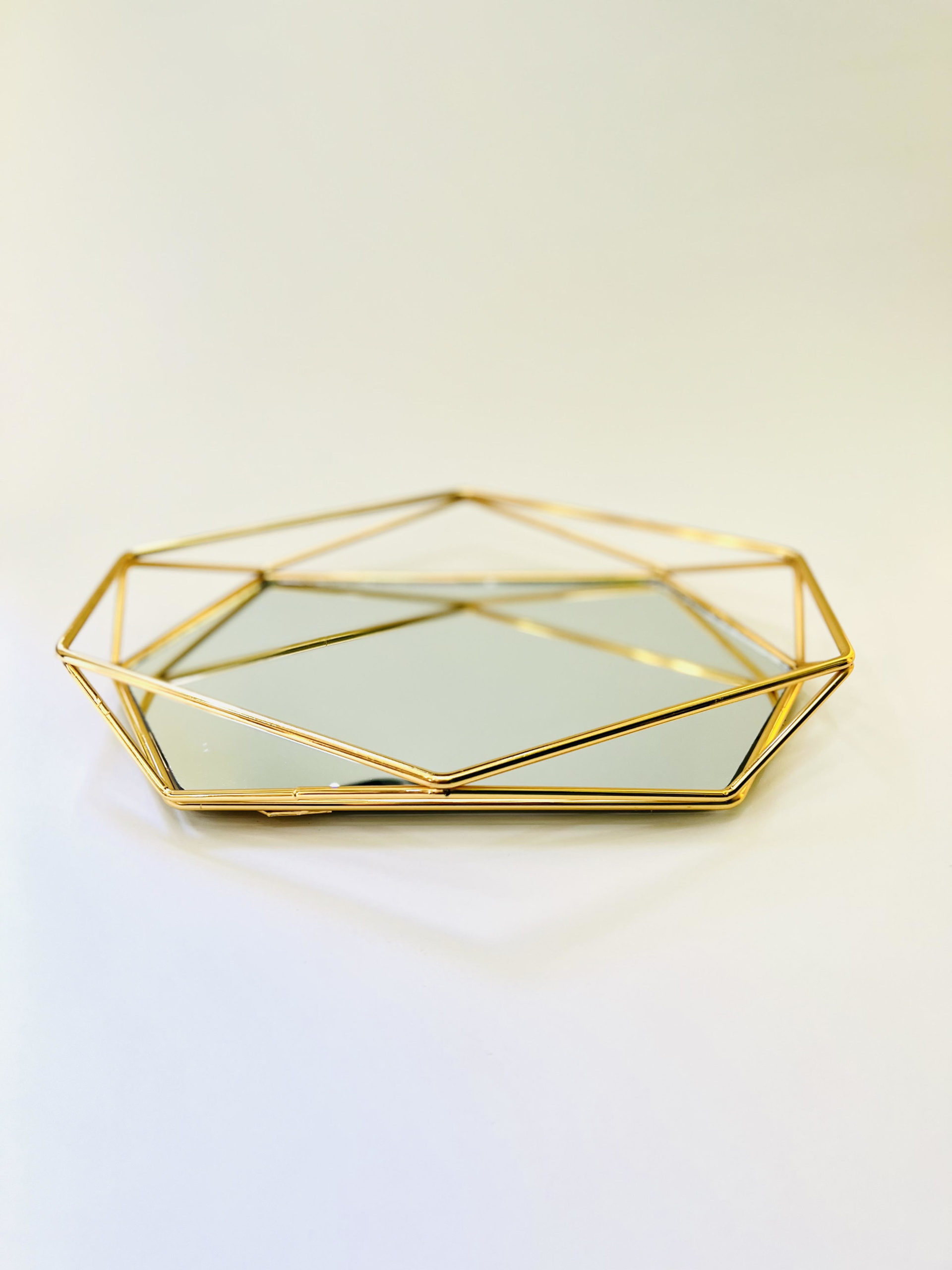 Un plateau miroité de 33 cm x 29 cm de forme hexagonale en métal de couleur dorée