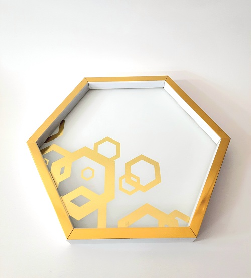 Un plateau en bois de forme hexagonale de 27 cm de couleur blanche avec motifs en dorés
