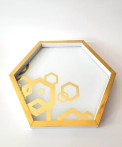 Un plateau en bois de forme hexagonale de 27 cm de couleur blanche avec motifs en dorés