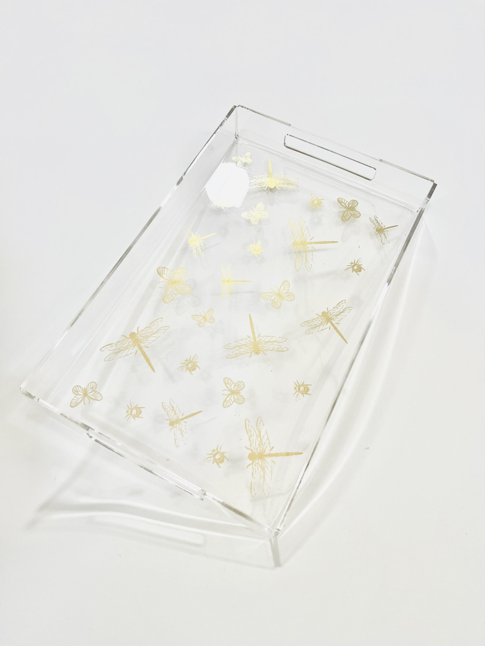 Un plateau en plexiglas de forme rectangulaire de 33 cm x 20 cm avec motifs dorés