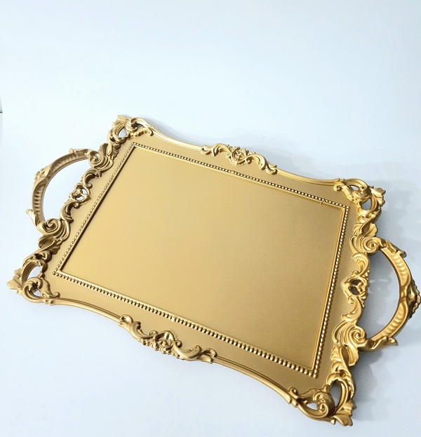 Un plateau pour gâteaux en plastique rigide de forme rectangulaire de 38 cm x 28 cm de couleur dorée