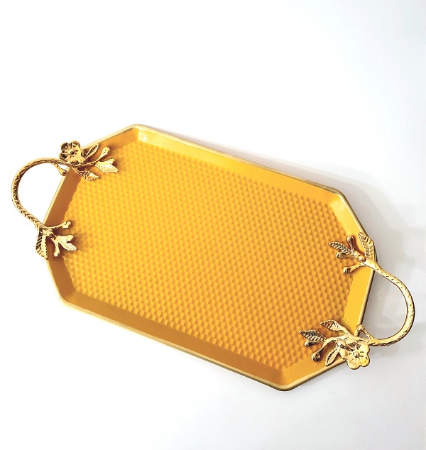 Un plateau à gâteau en métal aven main en plastique de forme rectangulaire de 21 cm x 36 cm de couleur jaune