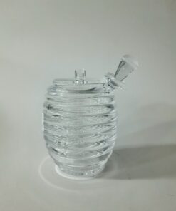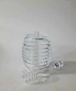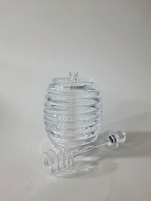 Un pot à miel avec cuillère fait en plexiglas de 12 cm de hauteur
