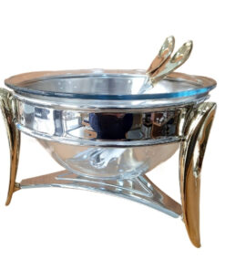 Un saladier en verre passable sur le feu et four d’une capacité de 4 litres de 27 cm de diamètre avec support en inox et couverts à servir