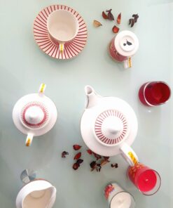 Un service à café en porcelaine fine pour 6 personnes composé de 6 tasses avec sous tasse, d’une théière, d’un sucrier et d’un crémier