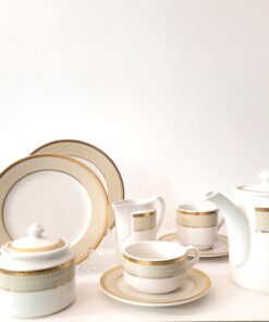 Un service à café de 44 pièces de la marque Rak-Pocelain composé de 6 assiettes 18 cm 6 assiettes 21 cm, 12 tasses à café au lait avec 12 sous tasses, 2 sucrières, 2 crémiers, 2 Théières forme basse et de 2 théières forme haute