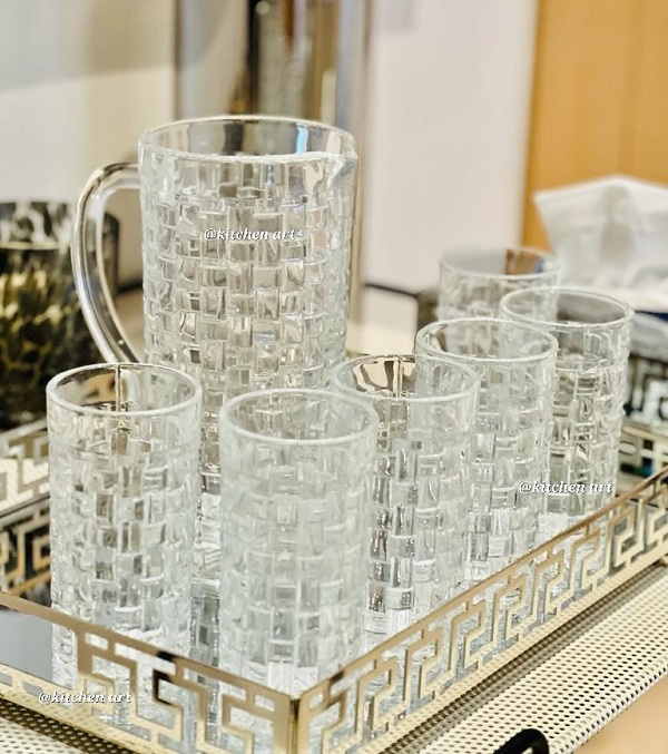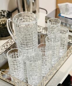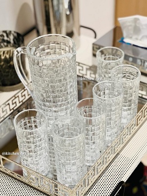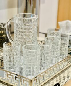Un service à eau en verre soufflé composé d’une carafe à jus et de 6 verres de forme longue