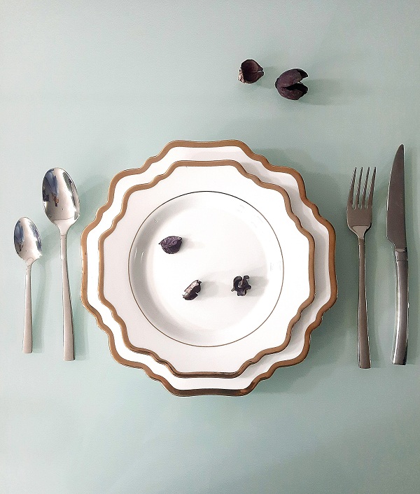 Un service de table en porcelaine fine ultra blanche de forme courbée composé de 6 grandes assiettes de 27 cm et de 6 assiettes moyennes de 21 cm