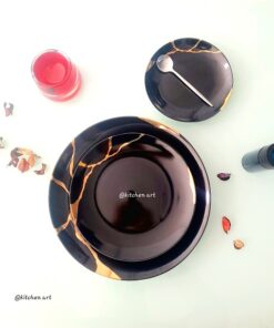 Un service de table en porcelaine fine de couleur noire pour 6 personnes peint à la main et composé de 6 grandes assiettes 6 moyennes et 6 petites