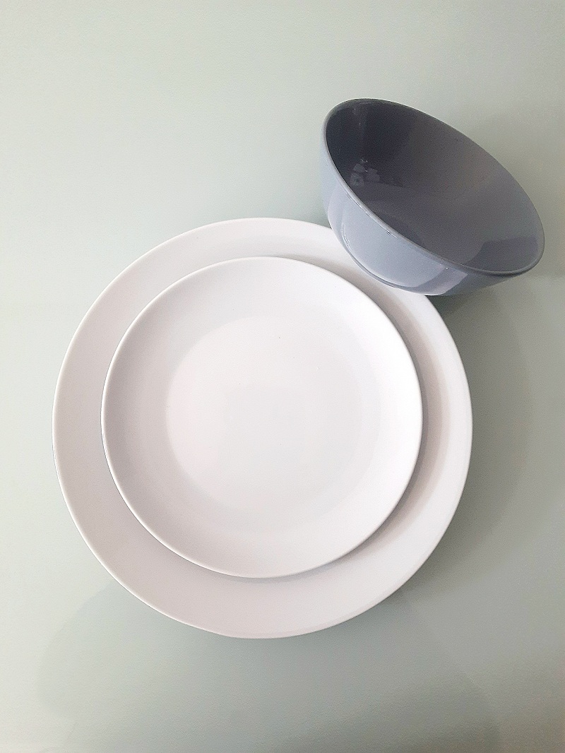 Un service de table en porcelaine de 18 pièces composé de 6 assiettes moyennes et de 6 assiettes grandes et de 6 bols