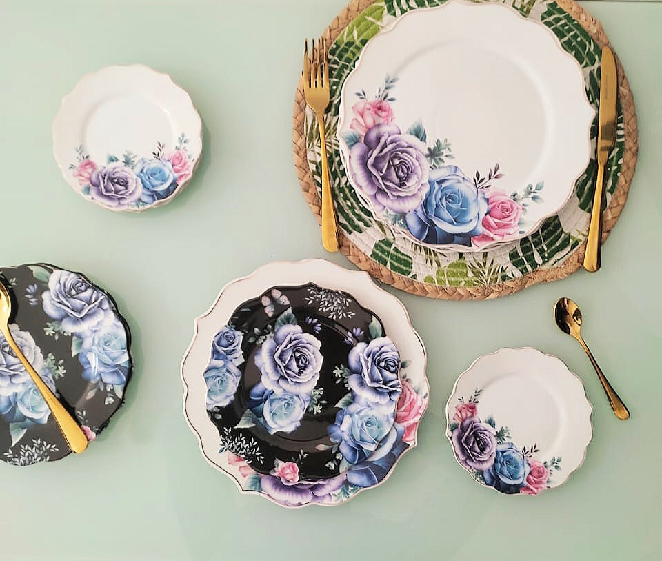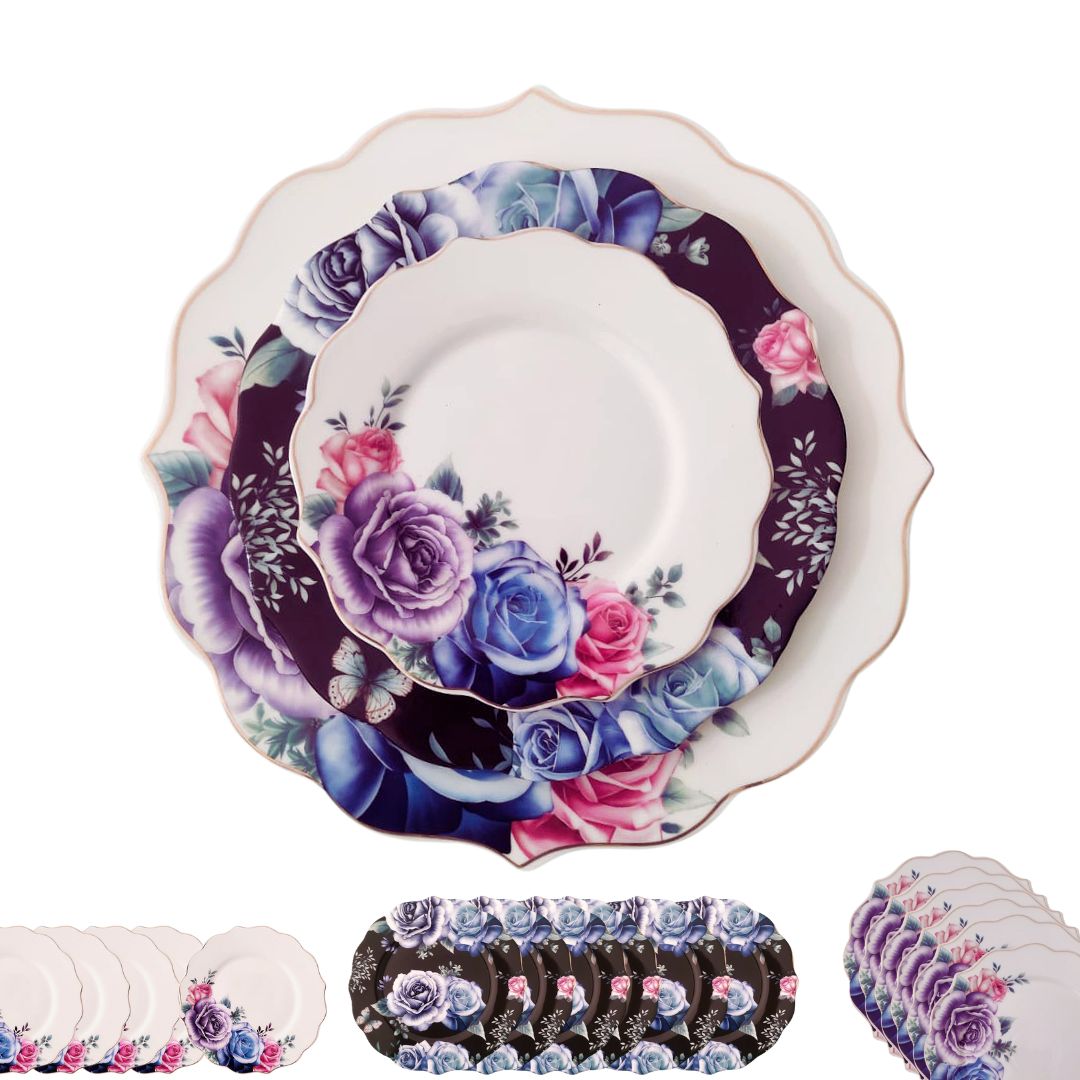 Chaque assiette est ornée d’un magnifique motif floral aux teintes délicates de noir, rose, bleu et mauve, créant une harmonie visuelle qui apportera une touche de sophistication à votre table. La porcelaine fine garantit non seulement une esthétique élégante, mais également une durabilité qui résiste à l’épreuve du temps.
