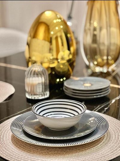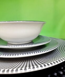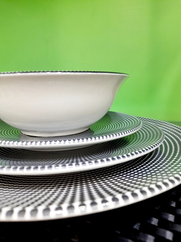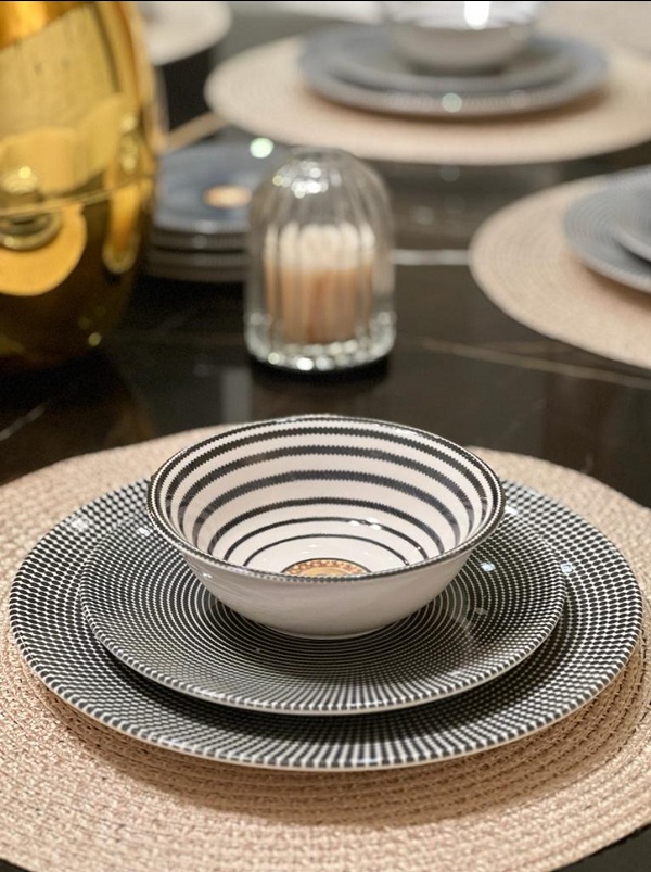 Un service de table de 24 pièces de couleur noire composé de 6 grandes assiettes, 6 moyennes, de 6 petites, de 6 bols