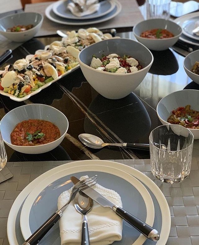 Un service de table en porcelaine fine de couleur bleu avec filet en blanc pour 6 personnes composé de 6 bols, 6 assiettes de 21 cm, 6 assiettes de 25 cm et de 1 saladier