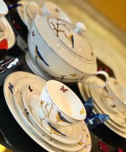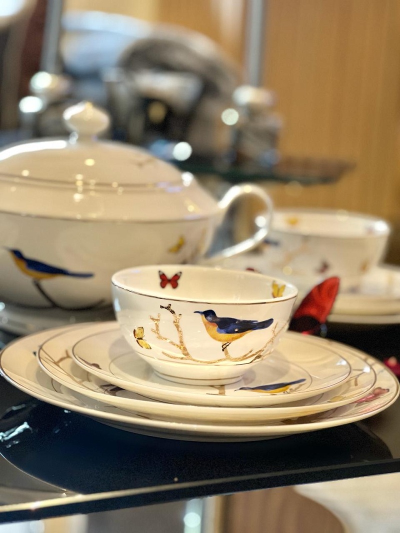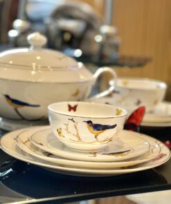 Un service de table en porcelaine fine ultra blanche de la collection oiseau composé de 6 grandes assiettes de 27 cm de 6 assiettes moyennes de 21 cm de 6 petites assiettes de 16 cm et de 6 bols plus une soupière