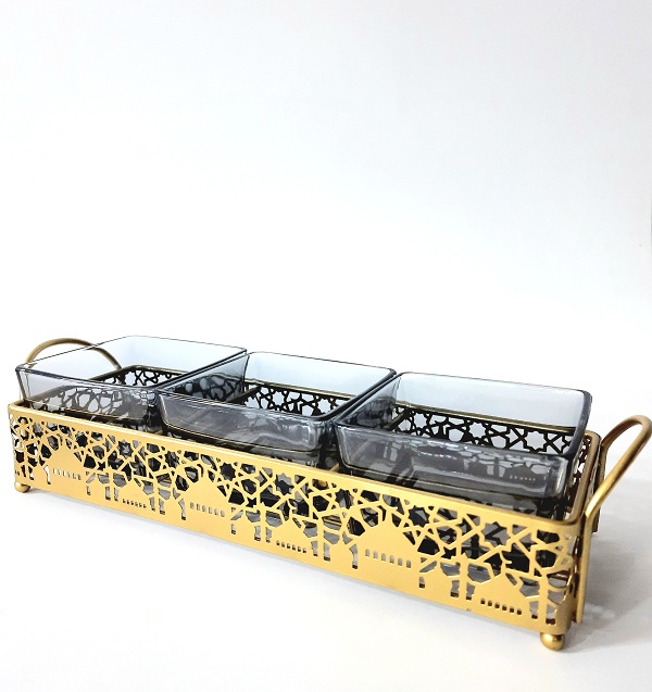 Un set composé de 3 bols en verre de forme carrée avec un support en doré