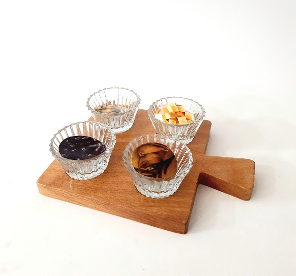 Un plateau en bois de 18 cm x 13 cm composé de 4 verrines de 4 cm de diamètre