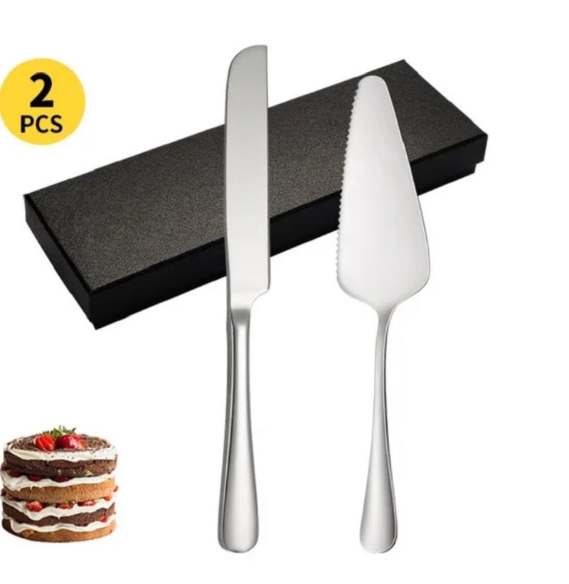 Un set de 2 ustensiles à gâteaux composé d’une pelle et d’un couteau en acier inoxydable de couleur argentée