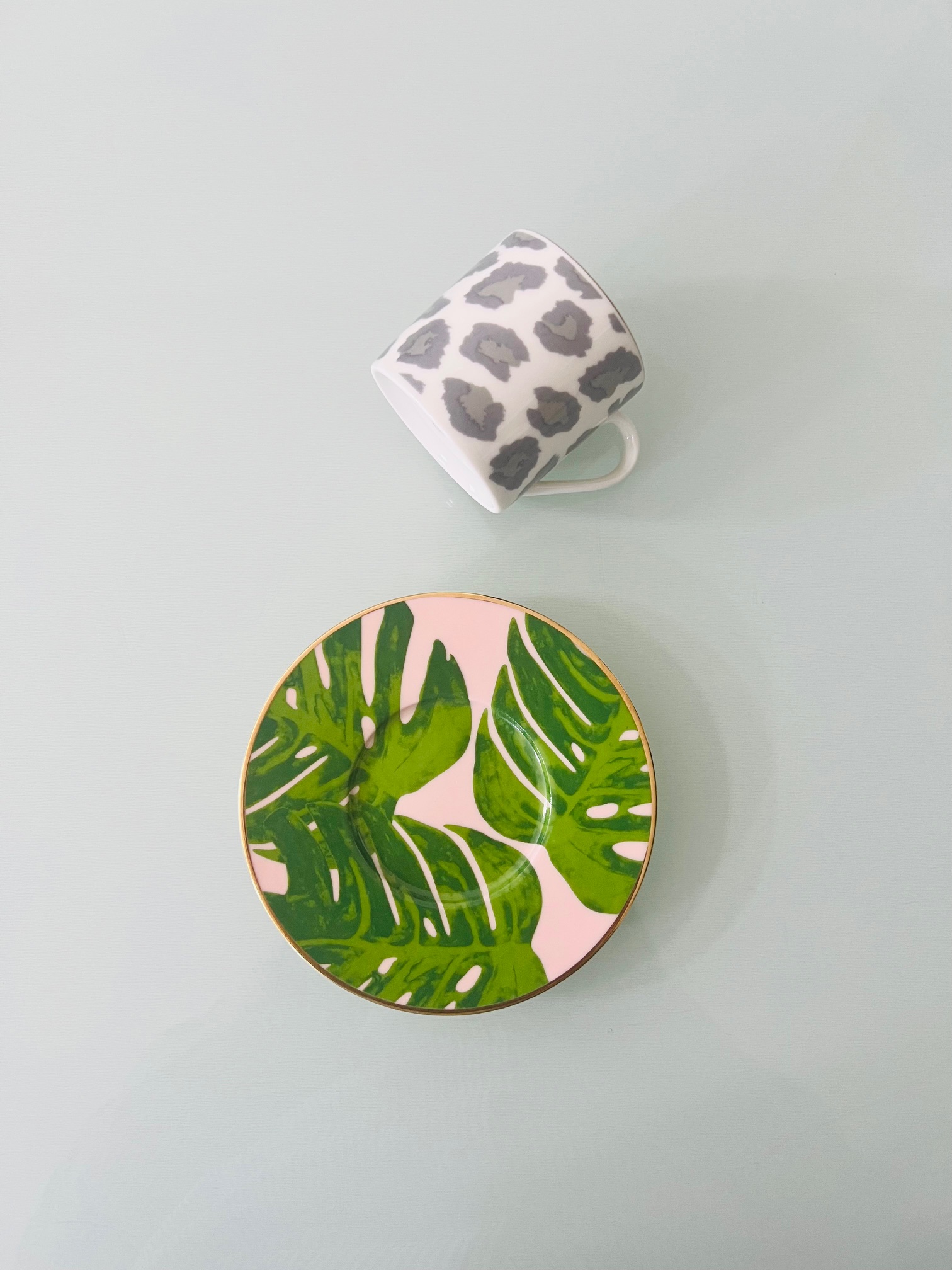 - Couleur : Les tasses sont présentées dans une couleur grise, et les sous tasses en feuillage de couleur verte
