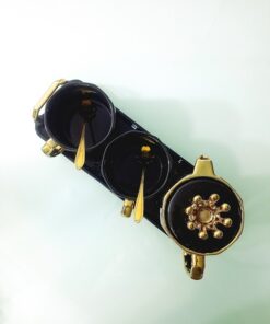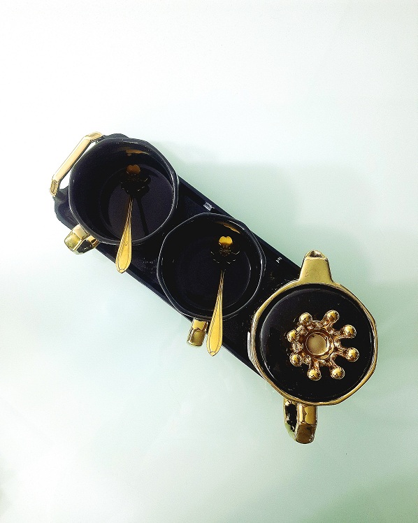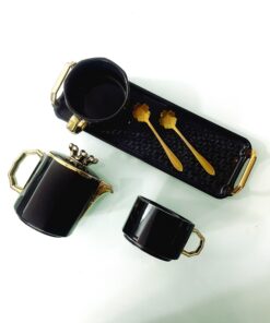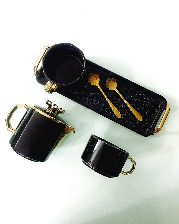 Un set de 6 pièces composé d’une théière avec 2 tasses à thé en porcelaine et de 2 cuillères dorés avec un petit plateau en plexiglas