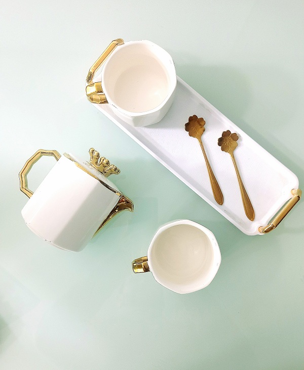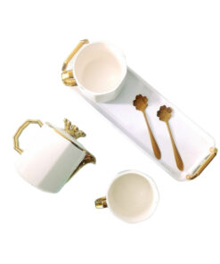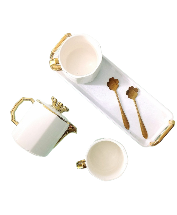 Un set de 6pièces composé d’une théière avec 2 tasses à thé en porcelaine et de 2 cuillères dorés avec un petit plateau en plexiglas