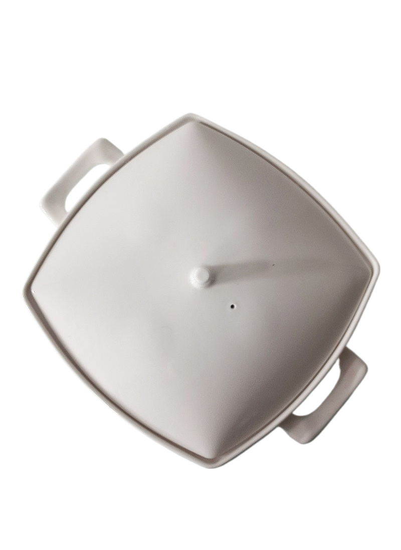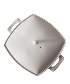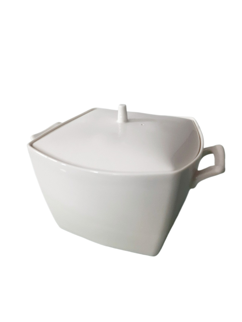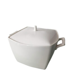 Une soupière blanche de forme carrée faite en porcelaine d’une capacité de 2100 ml et de 17 cm de hauteur