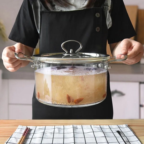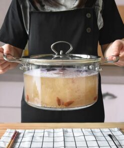 Une soupière en verre avec couvercle d’une capacité de 3500 ml faite pour résister aux températures extrêmes passable sur le feu et sur plaque