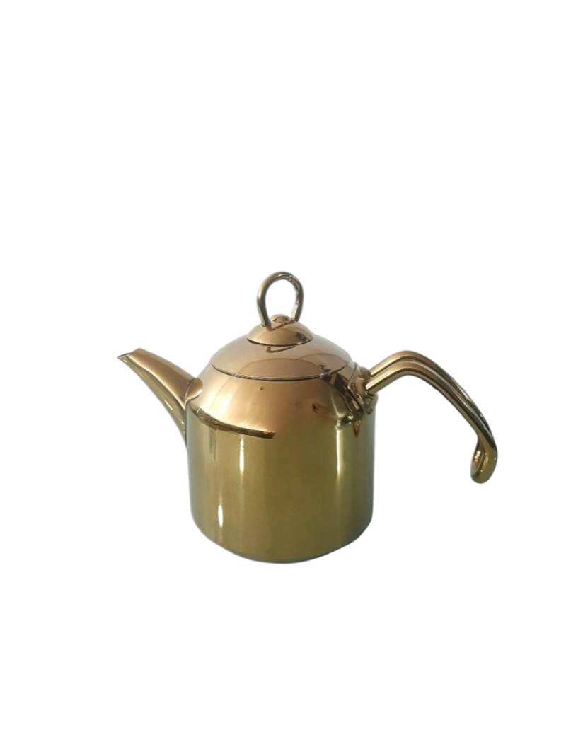 Une théière en inox 18/10 de couleur dorée d’une capacité de 0,9 litres avec une main non chauffante