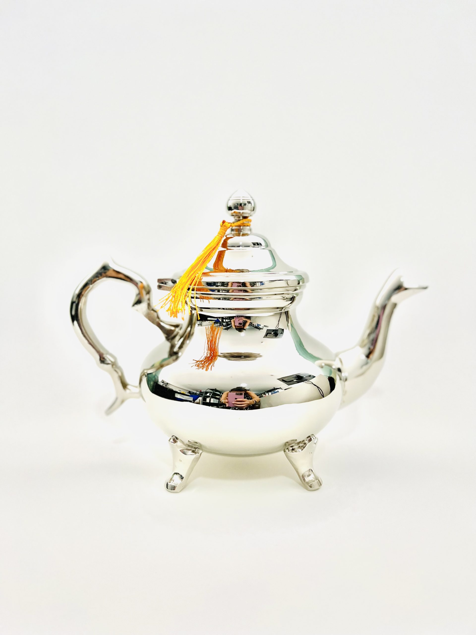 Une théière à pied faite en métal argentée d’une capacité de 6 verres