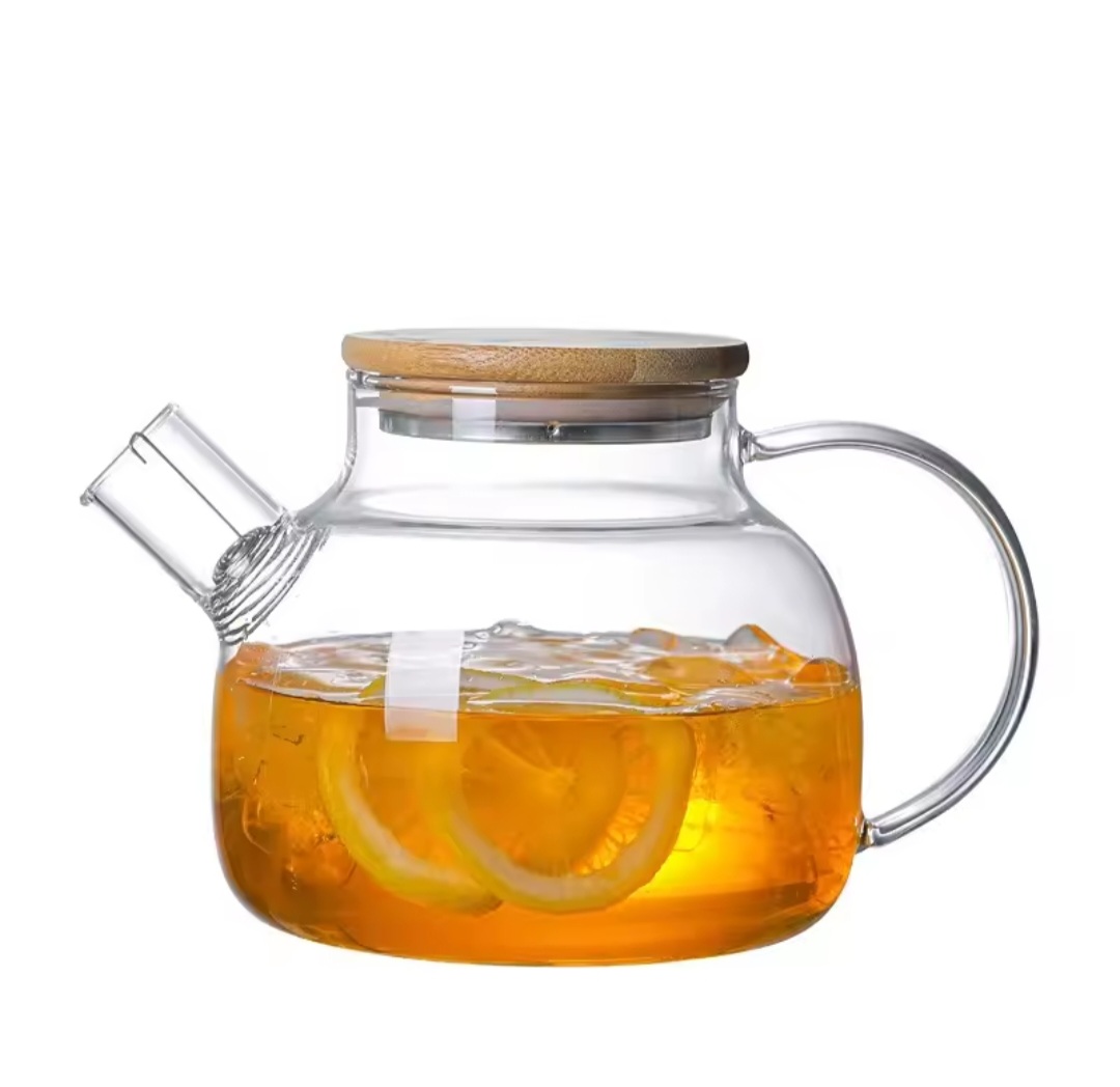 Une théière en verre de taille moyenne d’une capacité d’un litre résistante aux températures extrêmes et passable sur le feu et sur plaque électrique avec un couvercle en bois à fermeture hermétique