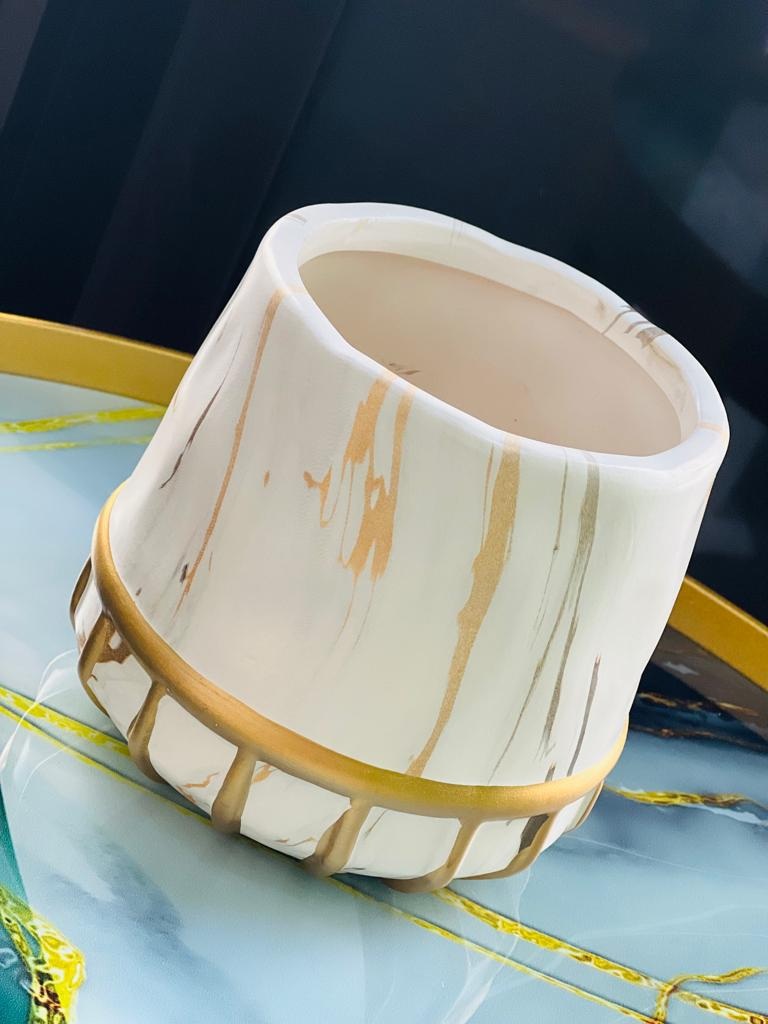 Un vase décoratif en porcelaine blanche de 16 cm x 16 cm avec filet en doré